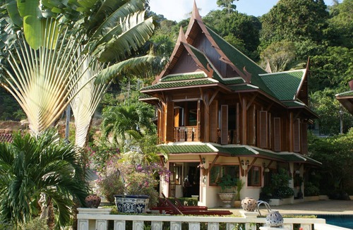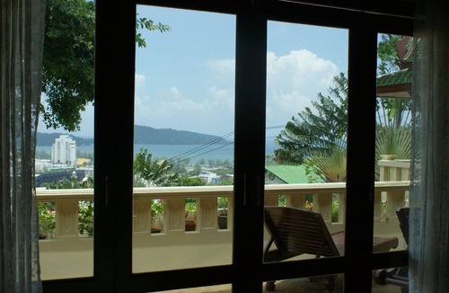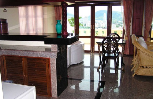Breakfast is included in the dayly and weekly rates. Luxury and large (85 sqm) apartment with terrace and panoramic view over the bay of Patong Beach. At a very quiet place, 80 m above sealevel, on the hill. Not far from beach (1.5 km) and from town center (2km). The access road is steep, it is advised to rent a motorbike or a car. The resort organises a free Shuttle to beach and town center 4 times a day. The resort is fitted with a restaurant, meeting room, fitness, sauna, massage rooms, pool, garden, and garage underground. The construction is Thai style.